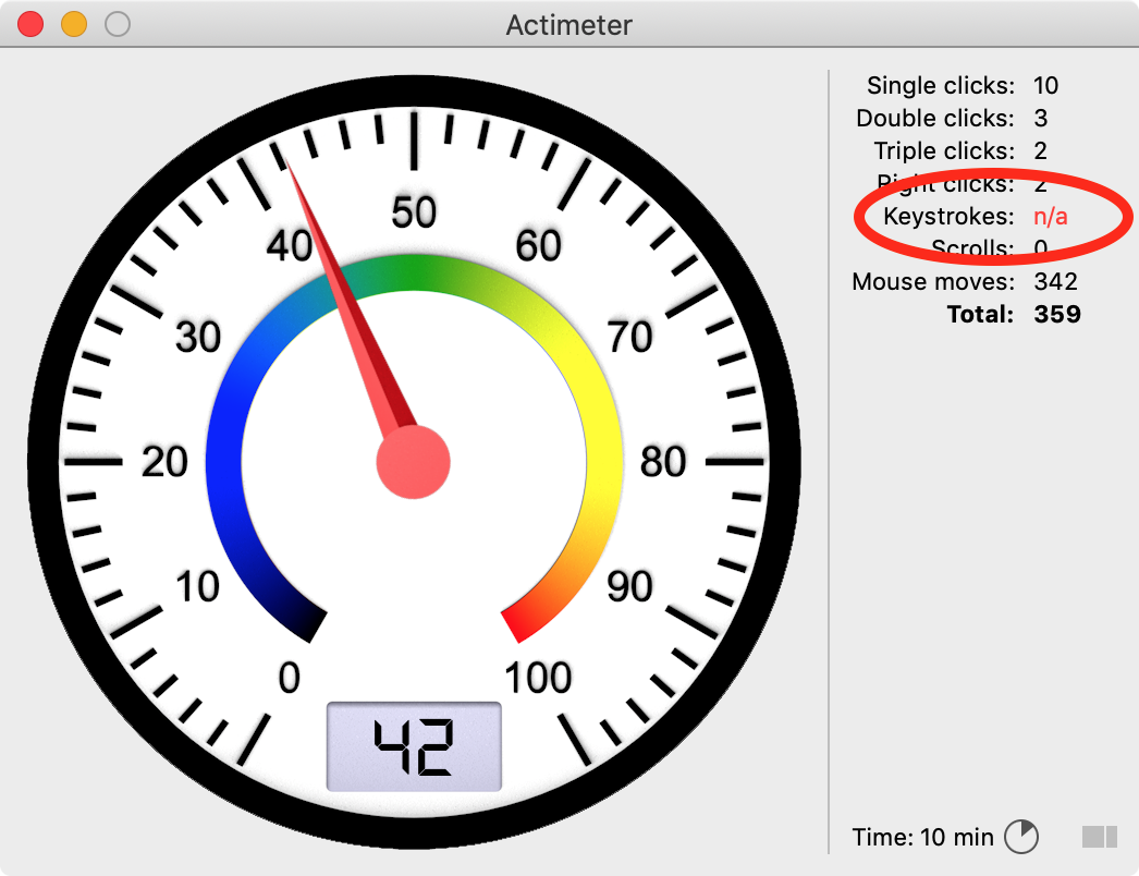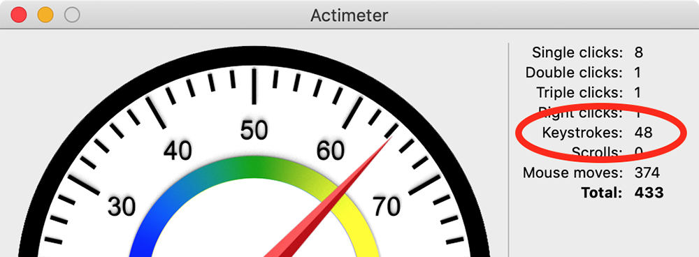 Privacy statement: Actimeter never records, stores or transmits any user actions (keystrokes, clicks, cursor locations or mouse movements). It only counts them.