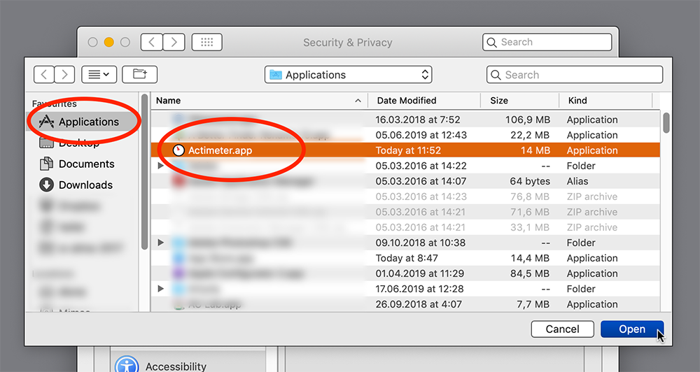 Step 8: Next, you need to point out Actimeter from your Mac's hard drive. Go to your Applications folder, select Actimeter and click "Open".